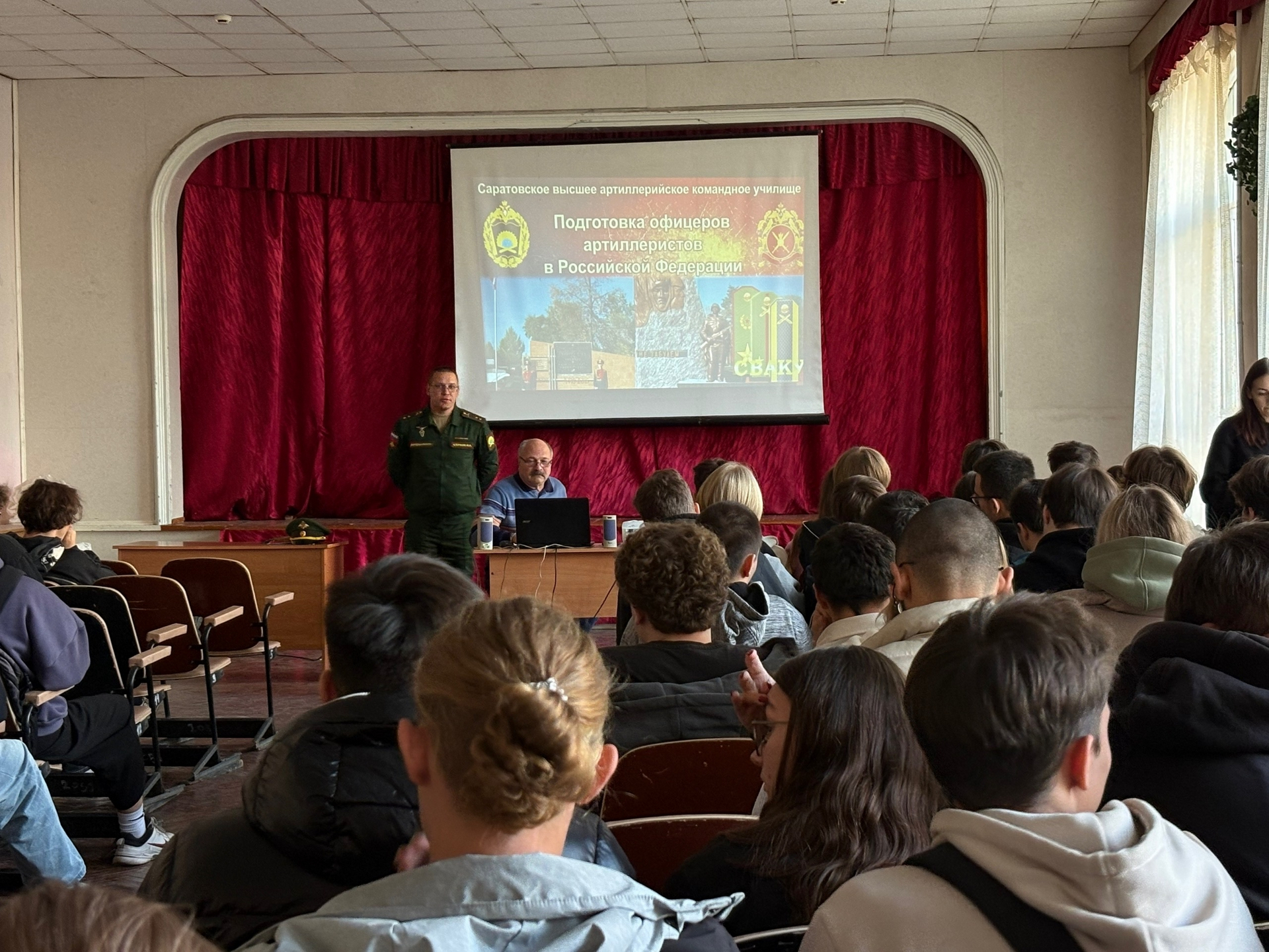 В ходе мероприятия Максим Алексеевич рассказал о различных аспектах получения образования в высшем артиллерийском командном училище, об условиях проживания и питания, обучающихся училища, а также о возможностях карьерного роста.