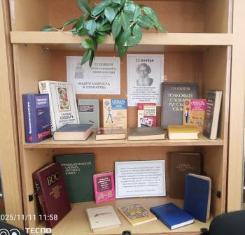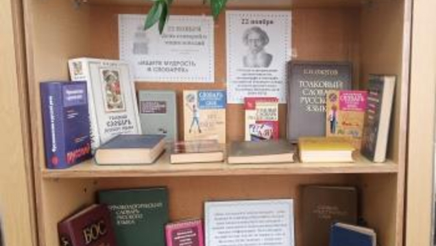 К этому дню в библиотеке колледжа подготовлена книжно-иллюстративная выставка «ИЩИТЕ МУДРОСТЬ В СЛОВАРЯХ!». На ней представлено многообразие энциклопедий и словарей по русскому языку, портрет В.И.Даля, цитата М.Н.Эпштейна. Они помогают нам найти информацию о прошлом и настоящем, даты, факты, цифры, названия, имена.