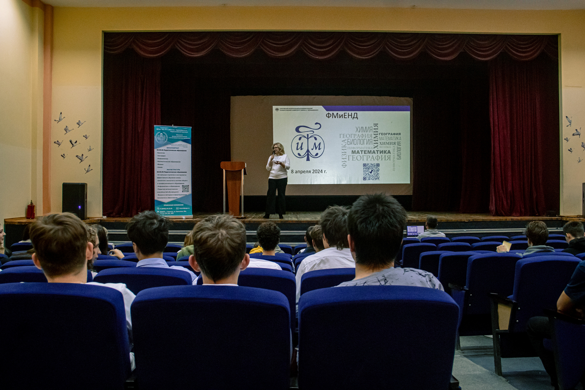Встреча началась со знакомства с факультетом физико-математических и естественно-научных дисциплин Педагогического института, где готовят педагогов математики, физики, информатики, химии, биологии и географии. Благодаря ознакомительным видеороликам учащиеся смогли понять, какими исследованиями занимаются современные биологи, какие задачи решают географы, насколько обширны области применения математики и в чём заключается особенность профессии учителя информатики в современном цифровом мире. Особый акцент в презентации был сделан на обучении робототехнике и смежным направлениям.