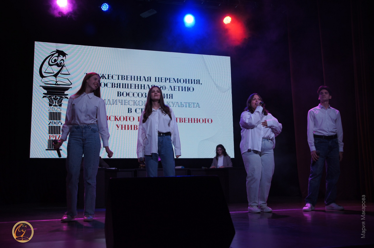 14 октября 2025 года в актовом зале Х корпуса состоялась Торжественная церемония, посвященная 20-летию воссоздания юридического факультета в стенах СГУ им. Н.Г. Чернышевского. Зрители стали свидетелями уникального судебного процесса по делу № 20: Время против Юридического факультета.