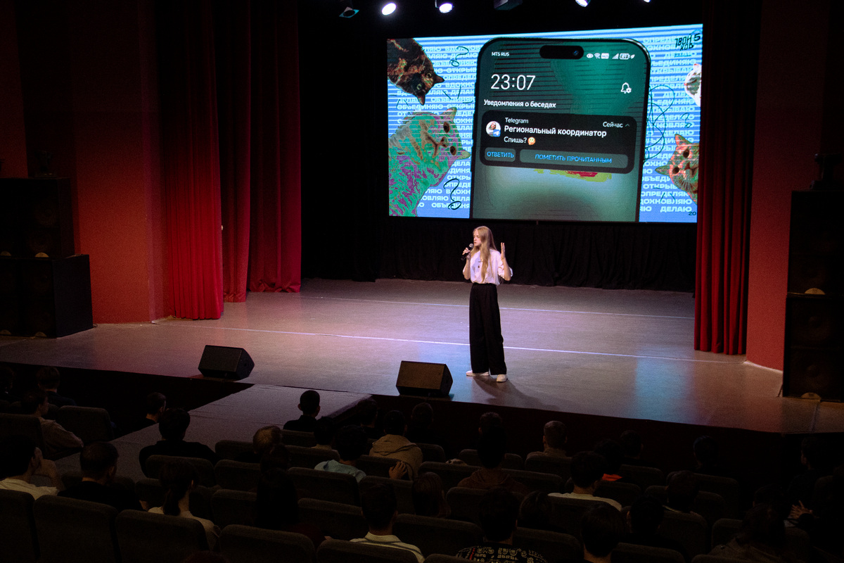Если вы хотите попробовать себя в роли спикера или создавать мастер-классы, образовательные программы, проводить проектные сессии, организовывать мероприятия – мы занимаемся этим в нашей региональной команде проекта “Твой ход”. Мне очень радостно видеть в зале большое количество людей, которые, надеюсь, заинтересуются проектом и будут вместе с нами развивать наше единое студенческое сообщество.