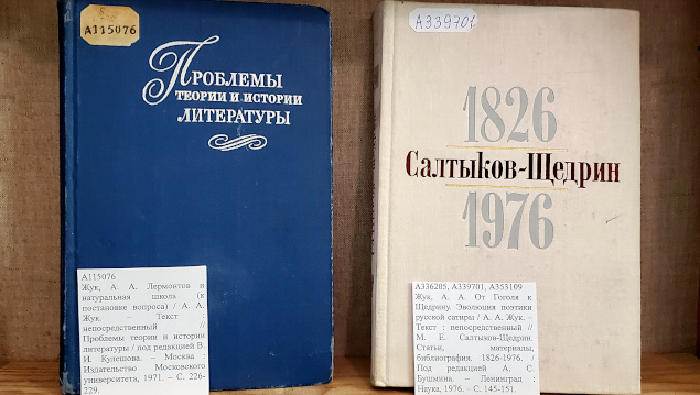 Основу выставки составили монографии о «Современной идиллии» Салтыкова-Щедрина, о сатире натуральной школы, о русской прозе XIX века; подготовленные ею отдельные тома полного собрания сочинений А. И. Герцена и М. Е. Салтыкова-Щедрина, издание «Свистка» - сатирического приложения к журналу «Современник» - в серии «Литературные памятники», сборник литературно-критических работ Н. Г. Чернышевского с подготовкой текста и примечаниями профессора А. А. Жук.