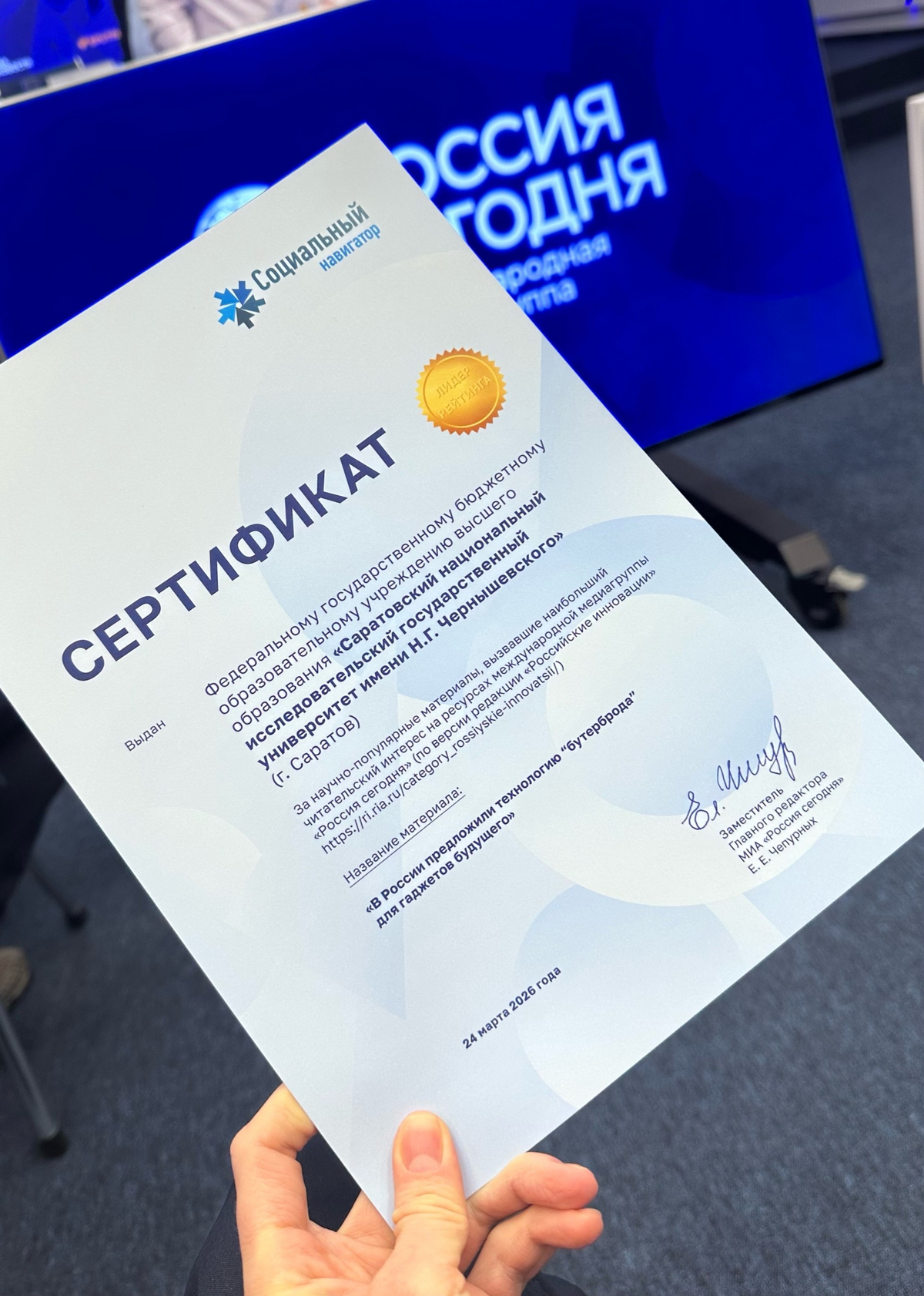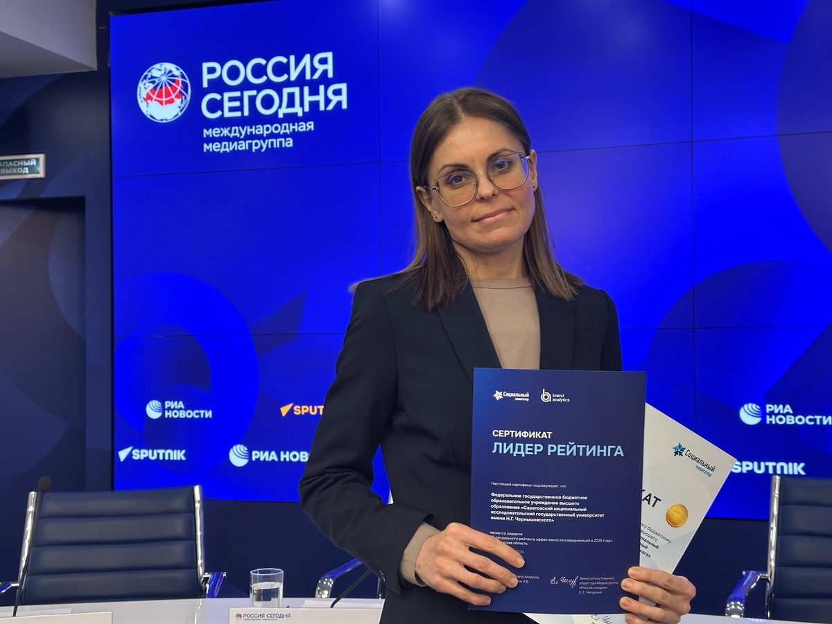 Результаты интегрального рейтинга эффективности коммуникаций в 2025 году были представлены в Москве 24 марта. Презентация состоялась на площадке международного пресс-центра медиагруппы «Россия сегодня» в рамках круглого стола «Российские университеты в публичном информационном пространстве: итоги 2025 года». В мероприятии и церемонии награждения лидеров приняла участие начальник Управления медиакоммуникаций СГУ Ю.Н. Аникеева.