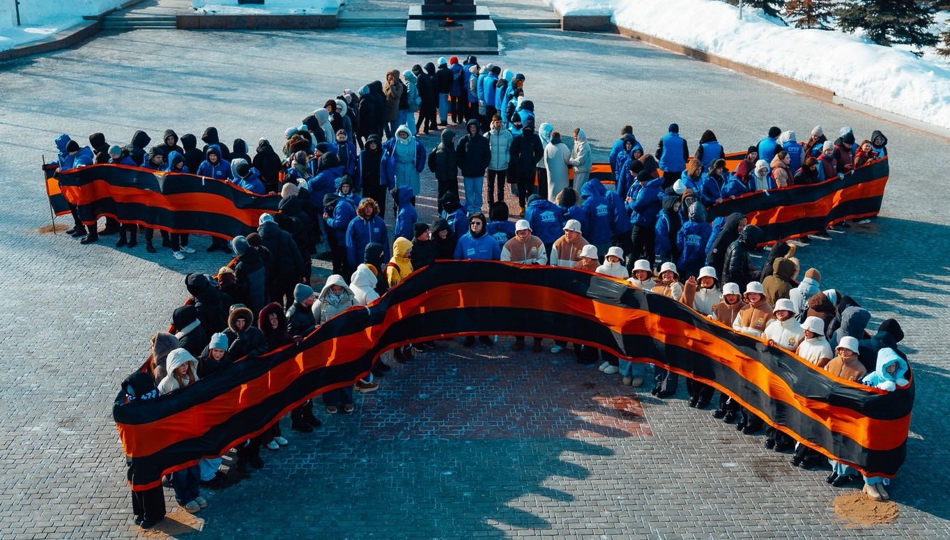 На площади у мемориала «Вечный огонь» собрались студенты саратовских вузов и активисты молодёжных общественных организаций. Участники выстроились в живую инсталляцию, образовав символическую фигуру звезды, а затем развернули огромное полотно Георгиевской ленты – одного из главных символов воинской славы и доблести русской армии. Масштабная лента в руках молодёжи стала олицетворением неразрывной связи поколений защитников Отечества.