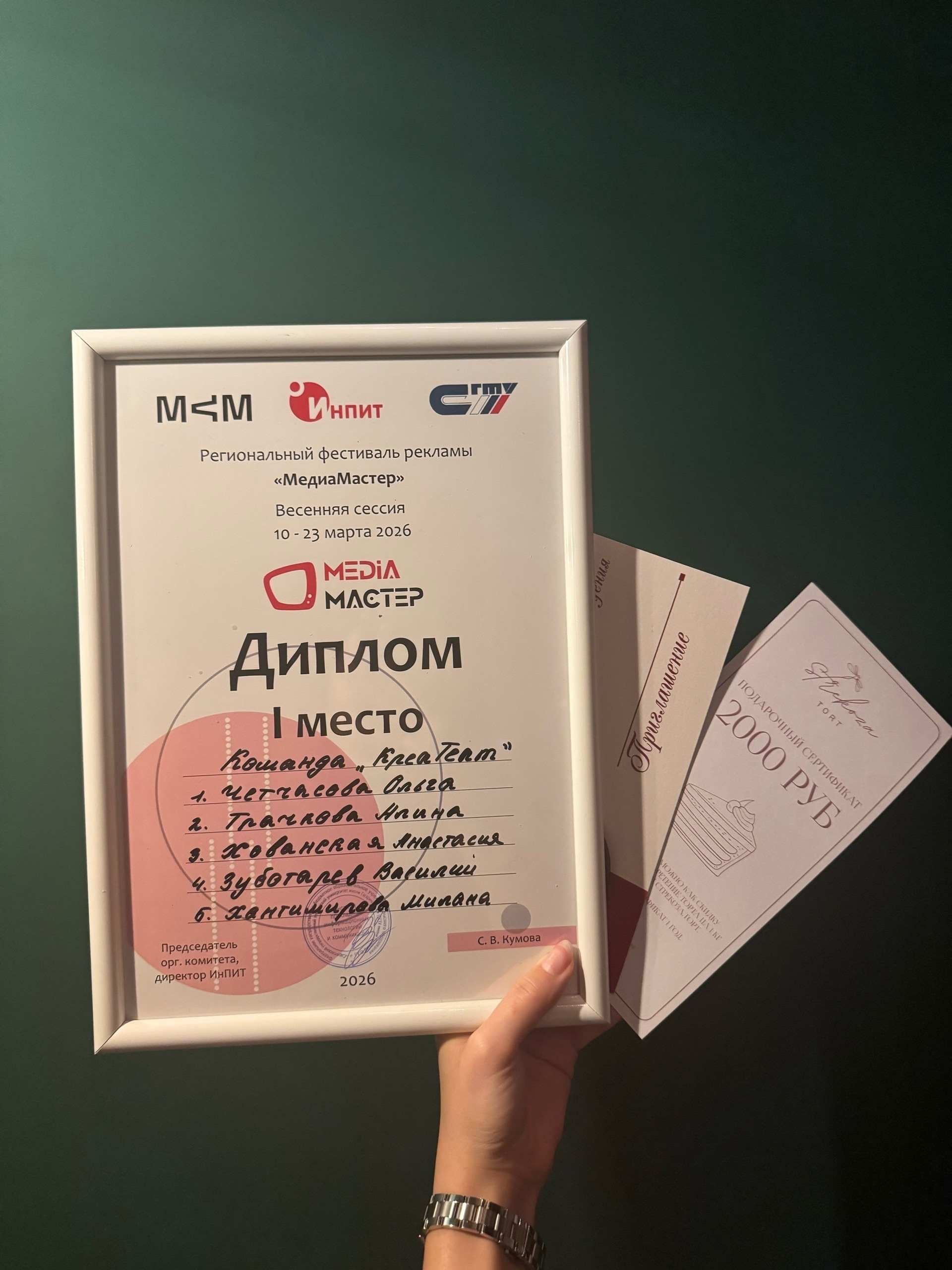 Команда «КреаTeam» в составе второкурсников Ольги Четчасовой, Анастасии Хованской, Василия Зуботарева, Миланы Хантимировой и Алины Трачковой заняла первое место за решение брифа от заказчика – кондитерской «Стрекоза.торт». Студенты разработали полноценный бизнес-план и концепцию продвижения нового кондитерского изделия, предложив заказчику не просто креативную идею, а готовый к реализации маркетинговый инструмент.