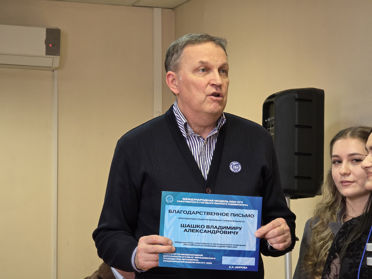 Председатель Саратовского регионального отделения Российской ассоциации содействия ООН В.А. Шашко в своём выступлении рассказал о важности проведения подобных мероприятий среди студентов для приобретения опыта и знаний в дипломатической сфере.