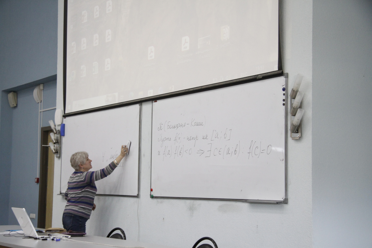 На доске разбирались ключевые теоремы, включая знаменитый постулат Больцано – Коши о промежуточном значении. С помощью графиков и вложенных отрезков лектор наглядно показала: если непрерывная функция на концах отрезка принимает значения разных знаков, внутри обязательно найдется точка, где она равна нулю.