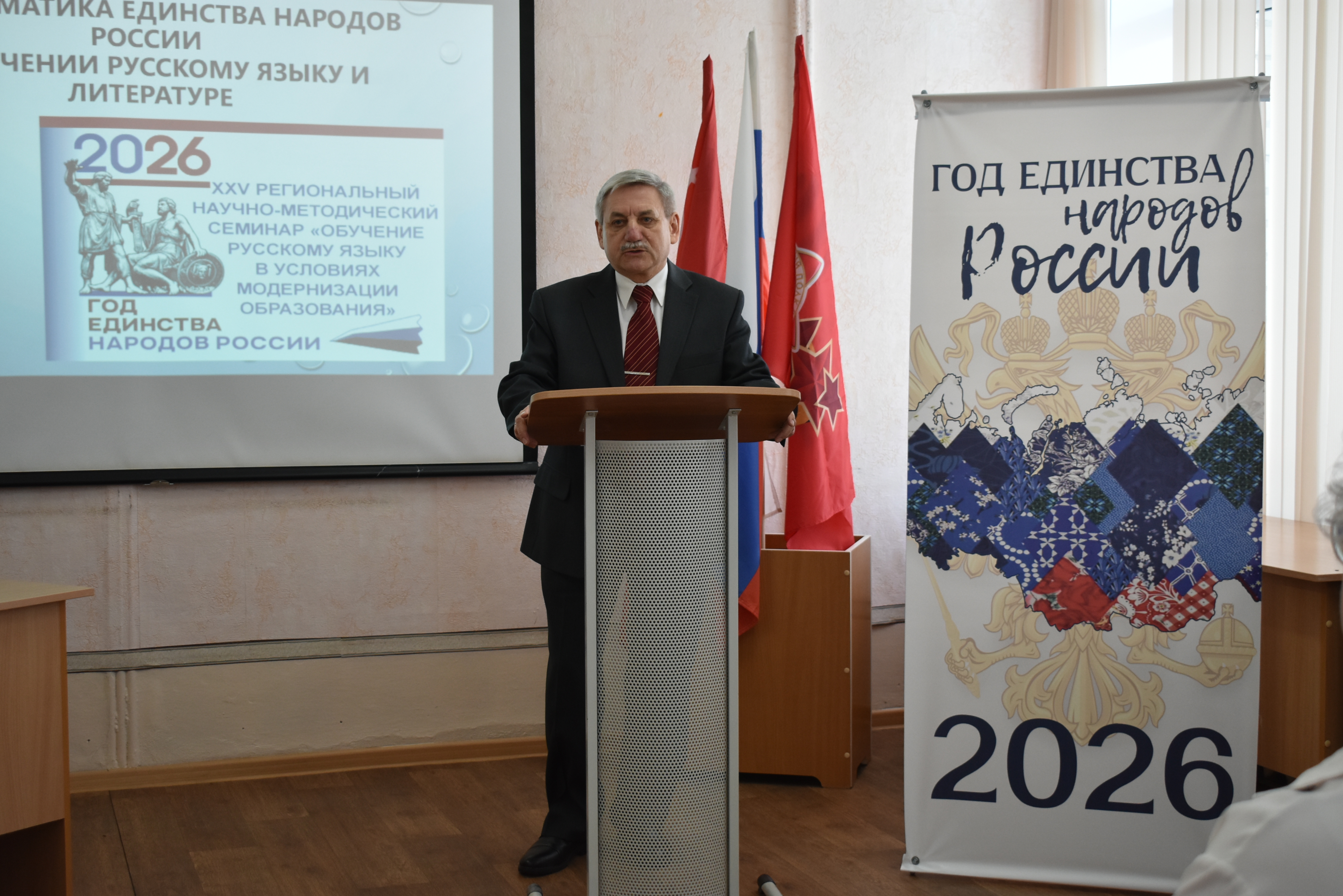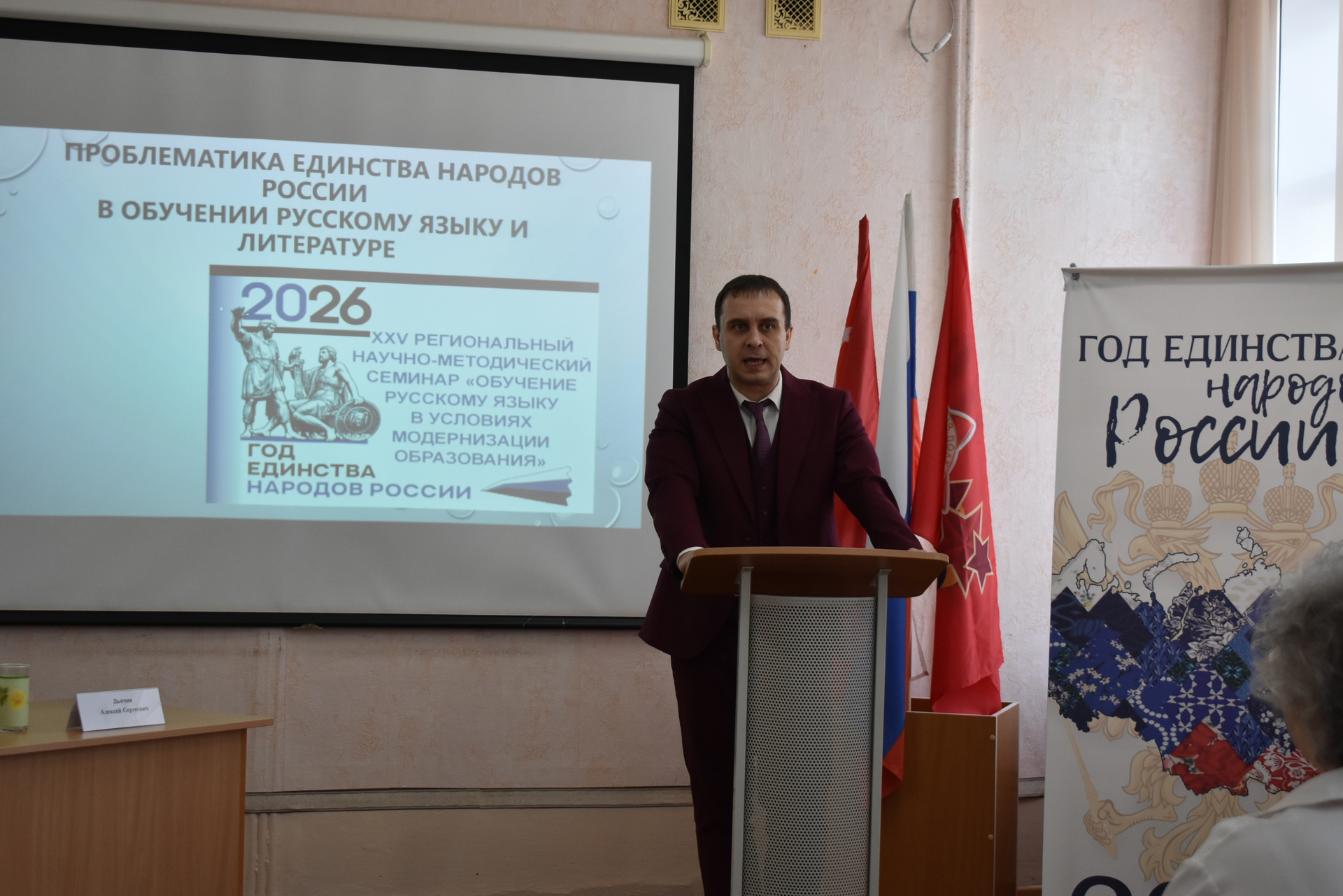 На пленарном заседании были прочитаны доклады «Базовая роль русского языка и литературы в формировании мировоззрения обучающихся в едином образовательном пространстве России» (Е. Н. Прохвостова, начальник методического отдела МКУ «Центр информационно-методического и технического обеспечения учреждений образования БМР») и «Проблема единства народов России в зеркале современной отечественной литературы» (Е. А. Ясакова, канд. филол. наук, доцент кафедры филологических дисциплин БИ СГУ).