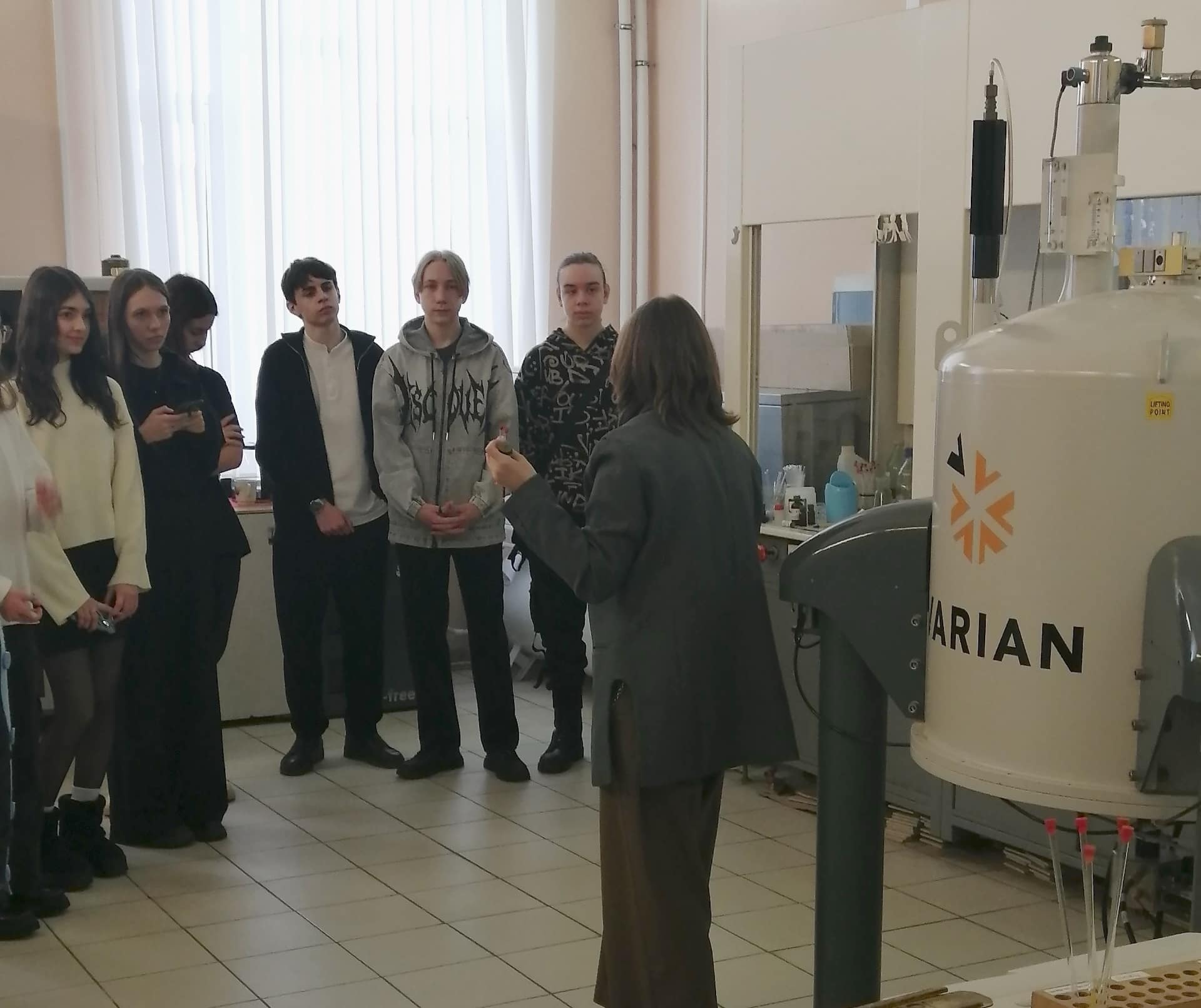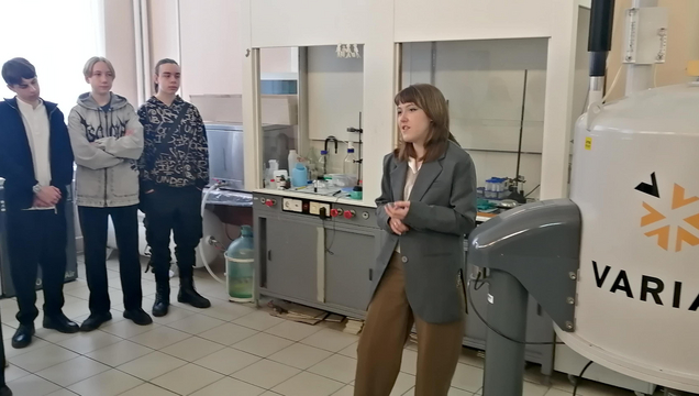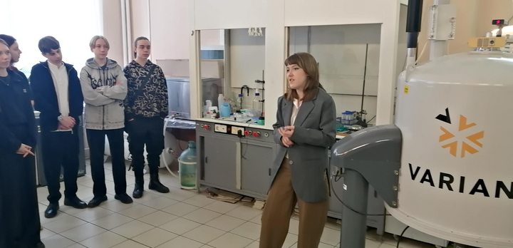 - кафедра органической и биоорганической химии, особенно много интересных и волнующих вопросов было задано инженеру и аспиранту кафедры Скляр Анне в современной спектральной лаборатории, оснащенной спектрометрами ЯМР Varian-400 и ИК СМ-1201, ВЭЖХ LC-20 «Prominence», о которых ребята слышали, но никогда не видели.