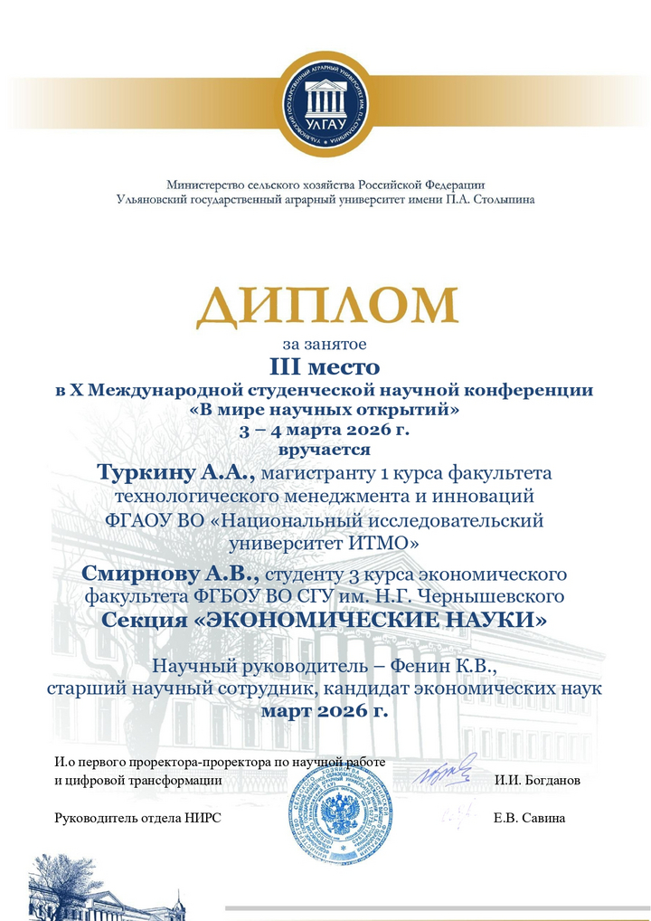 Студент 3-го курса Смирнов Алексей совместно с выпускником кафедры финансов и кредита СГУ, а ныне студентом 1 курса магистратуры факультета технологического менеджмента и инноваций ФГАОУ ВО «Национальный исследовательский университет ИТМО» Туркиным Андреем приняли участия в данном научном мероприятия. Они выступили в секции «ЭКОНОМИЧЕСКИЕ НАУК» с докладом на тему «Оценка эффективности инвестиций в жилую недвижимость с использованием ипотечного кредитования» (науч. рук. – ст. н.с. АННИО «ИПЭИ», к.э.н., доцент – Фенин К.В.). В нем они рассмотрели перспективу использования ипотечного кредитования квартиры в г. Москве, как инвестиционный проект и сравнили его с другими доступными инструментами. Доклад студентов вызвал сильную дискуссию по поводу расширения инструментария инвестирования. По результатам работы секции Смирнов Алексей и Туркин Андрей были награждены дипломом 3 степени.