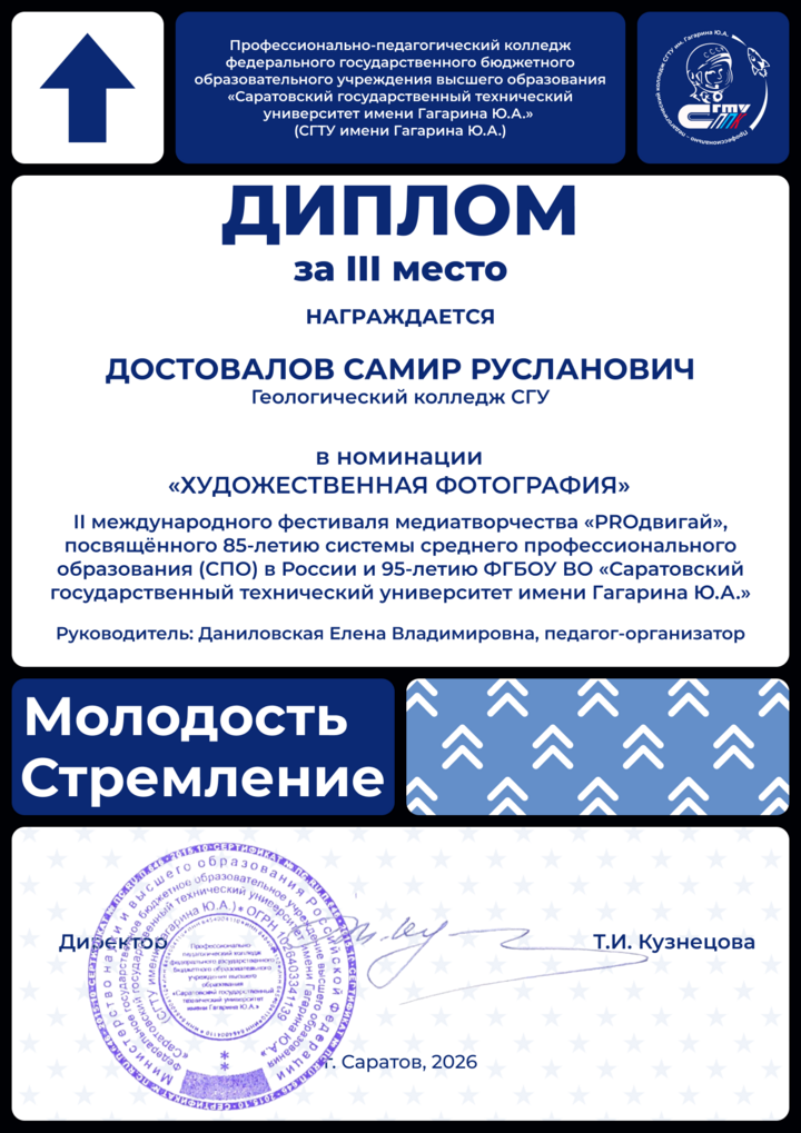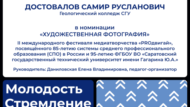 Для развития социальной активности талантливых исполнителей и коллективов в области медиа и информационных технологий, студент первого курса геологического колледжа СГУ группы 2142 Доставалов Самир (под руководством педагога-организатора Е.В.Даниловской), принял участие во II международном фестивале медиатворчества «PROдвигай».