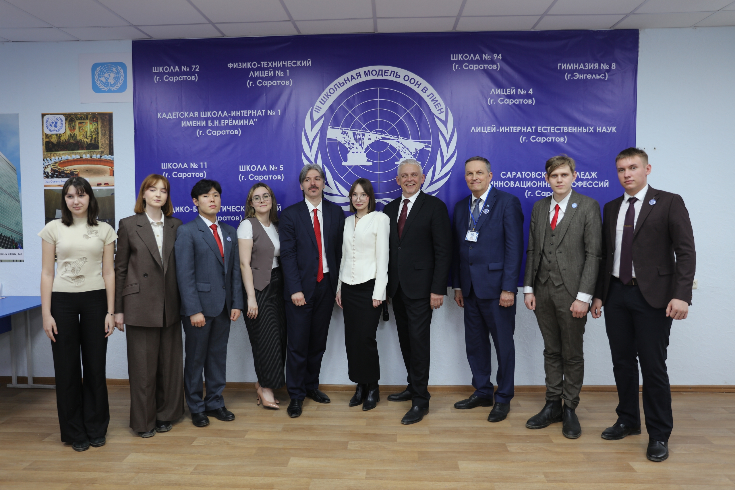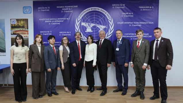 В число почетных гостей модели ООН вошли представители общественности, бизнеса и научно-образовательного сообщества Саратовской области. От лица СГУ им. Н. Г. Чернышевского с приветственным словом к участникам мероприятия обратились проректор по международной деятельности С. А. Шилова, директор Института дополнительного профессионального образования, заведующий кафедрой международных отношений и внешней политики России, профессор Ю. Г. Голуб, декан юридического факультета, профессор Г. Н. Комкова и профессор кафедры международных отношений и внешней политики России В. Г. Цыплин. Они выразили уверенность в том, что все школьники благодаря данному образовательному проекту получат бесценный опыт ведения переговоров и поиска компромиссов в сложных ситуациях, который будет им полезен в жизни даже в том случае, если они не станут в будущем дипломатами. Помимо приветственных слов, в своем выступлении профессор Ю. Г. Голуб обозначил основные достижения ООН, а также трудности, с которыми сталкивается Организация Объединенных Наций в настоящий момент.