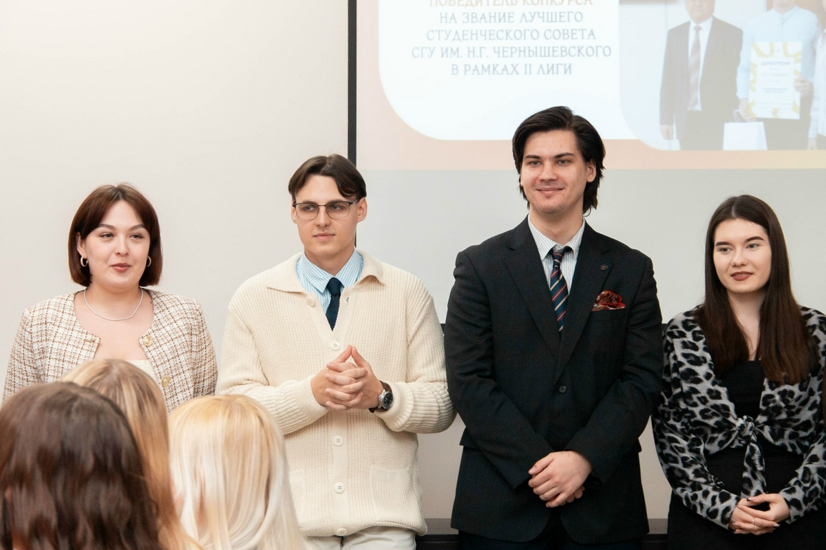 Кульминацией собрания стала церемония награждения. За активное участие в общественной и культурно-массовой жизни юридического факультета СГУ в 2025 году грамотами декана были отмечены студенты, проявившие себя наиболее ярко в разных направлениях деятельности. Среди награжденных – победители и призеры университетских, региональных и даже всероссийских конкурсов, участники творческих коллективов и медиа-команд, волонтеры, наставники - старосты учебных групп и тьюторы первокурсников, а также спортсмены факультета.