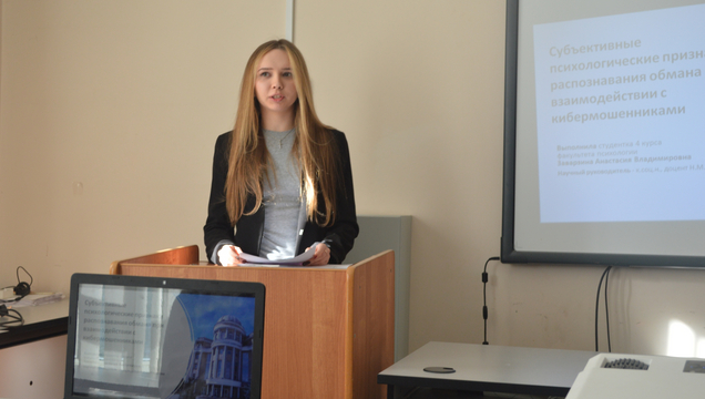 3 место – Заварзина Анастасия Владимировна, студентка 4 курса факультета психологии. Тема доклада: «Субъективные психологические признаки распознавания обмана при взаимодействии с кибермошенниками». Научный руководитель: к.соц.н., доцент Н.М. Романова.
