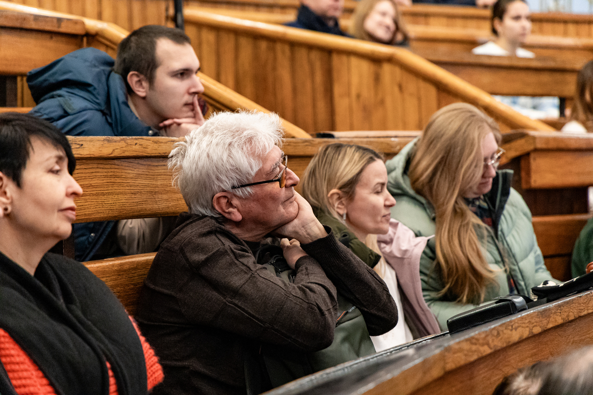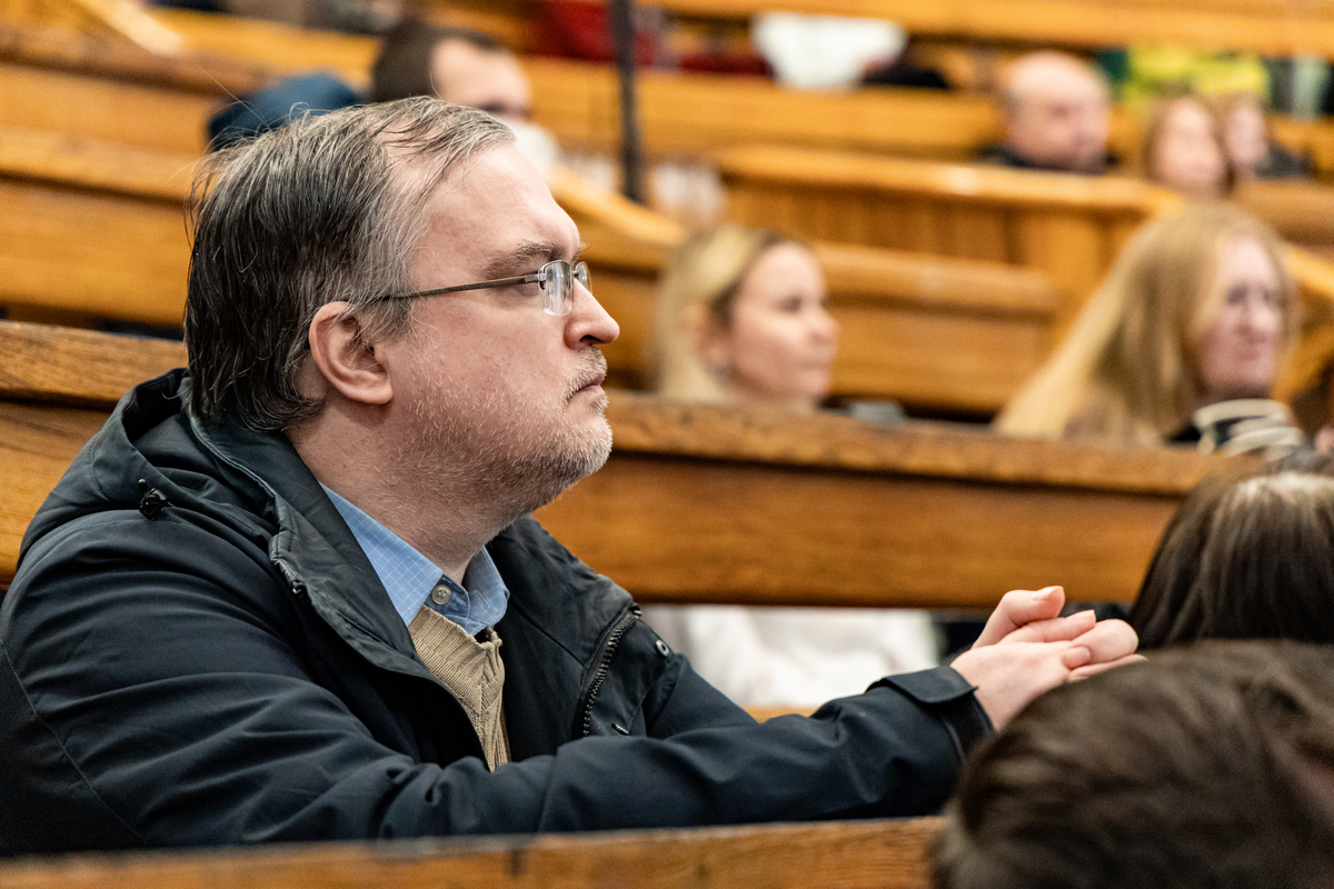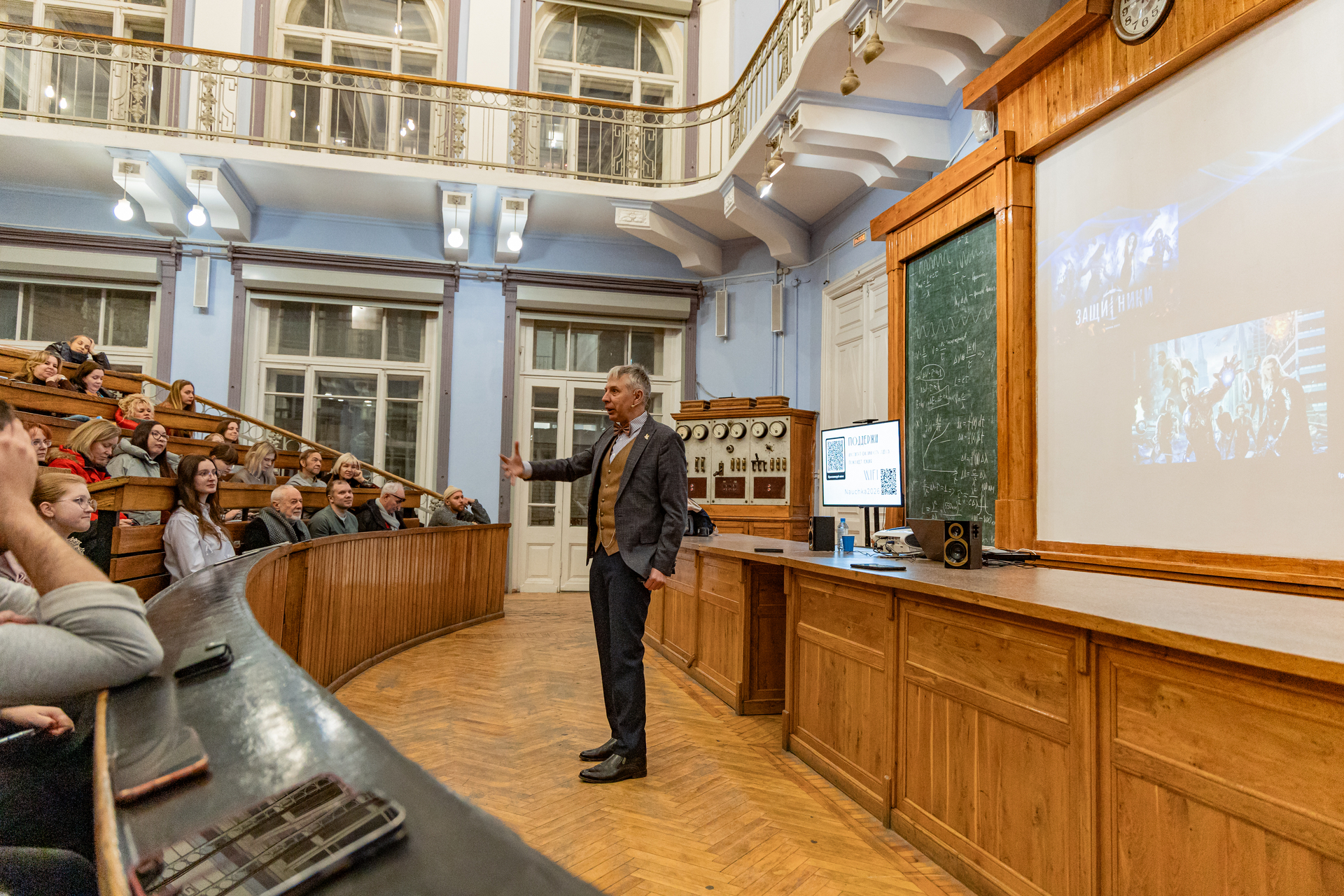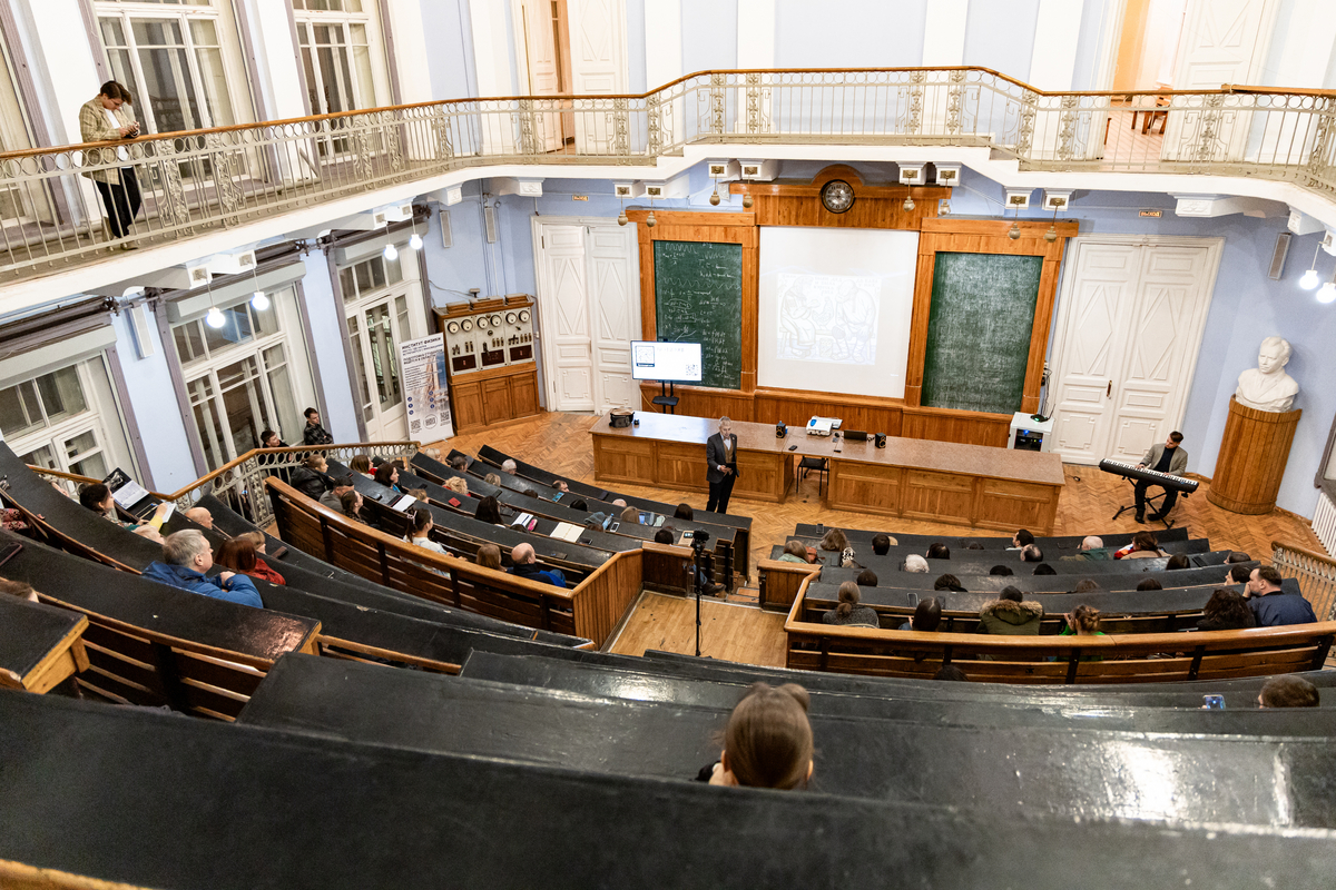 В знаменитой Большой физической аудитории СГУ рассуждали, чем мифы отличаются от сказок и почему на самом деле мы не знаем ни того, ни другого. Лекцию сопровождала игра на фортепиано в исполнении студента 4 курса Института химии Андрея Тараненко. Впервые за 115 лет в Большой физической аудитории играло пианино.