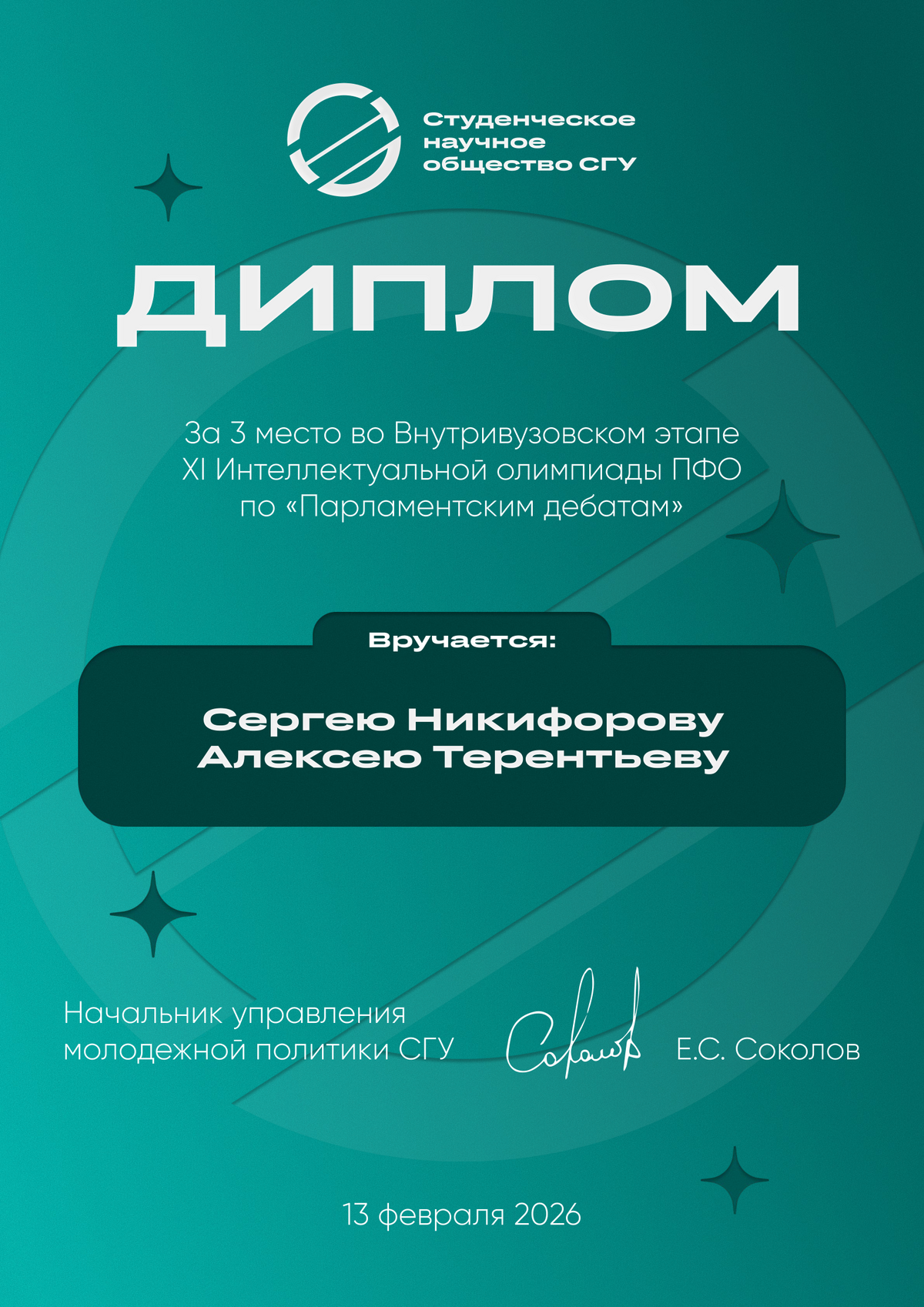 13 февраля 2026 года в СГУ завершился внутривузовский отборочный этап XI Интеллектуальной олимпиады Приволжского федерального округа среди студентов. Одним из заключительных состязаний стали Парламентские дебаты. Это динамичное и захватывающее соревнование потребовало от участников блестящего владения ораторским искусством, безупречной логики и умения работать в команде.