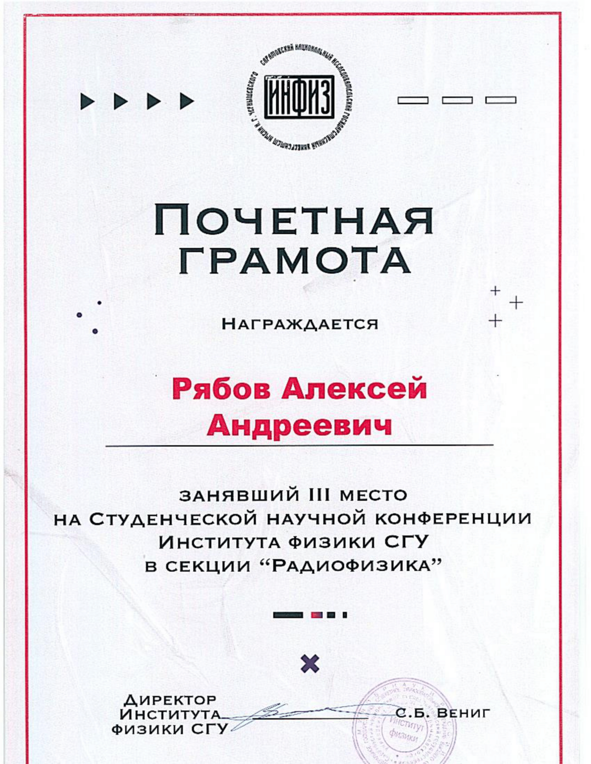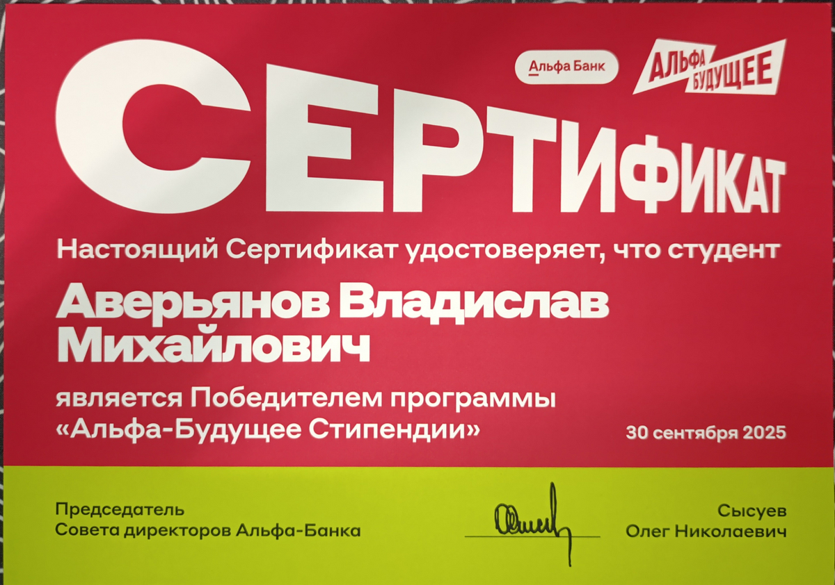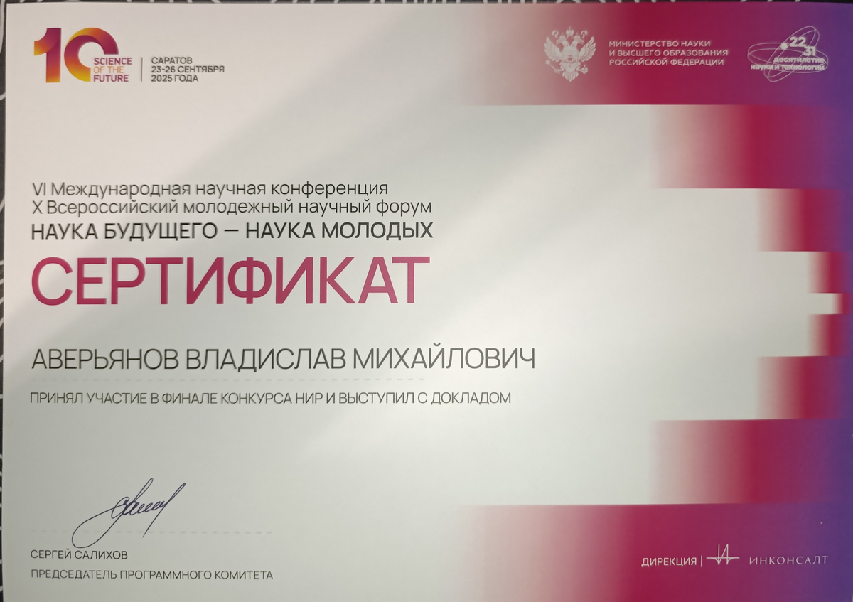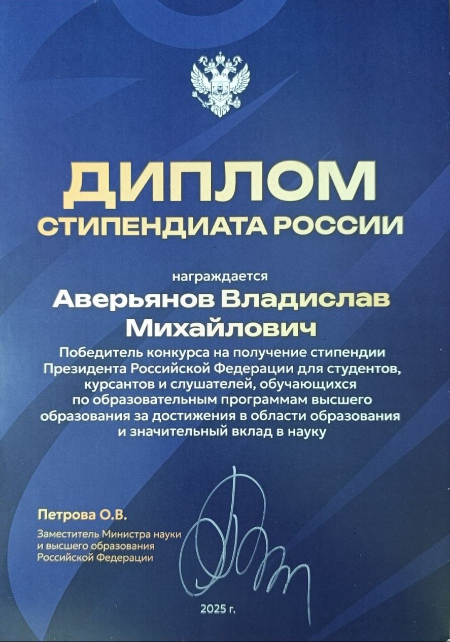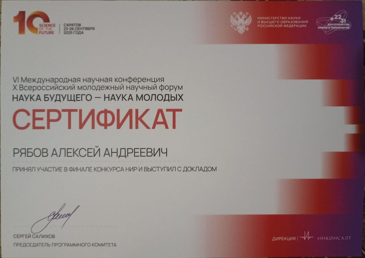 Кроме того, Алексей является финалистом 10-й всероссийской и 6-й международной конференции «Наука будущего – наука молодых» и обладателем Президентской стипендии для студентов в 2025/26 учебном году.