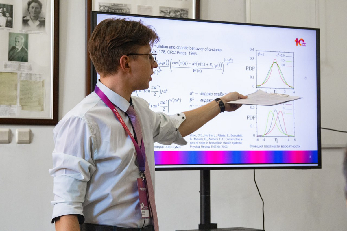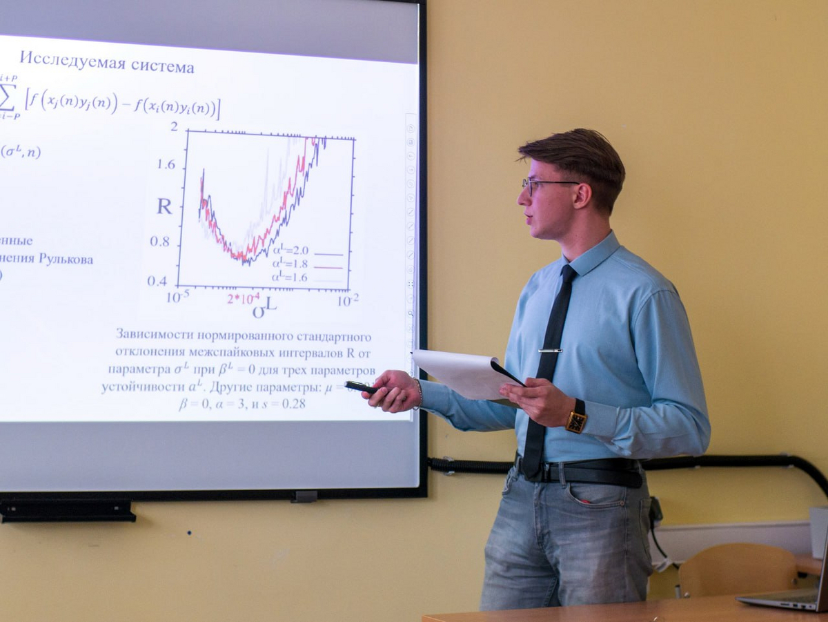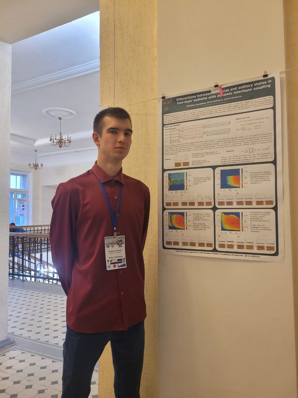 Владислав занимается научными исследованиями со 2-го курса бакалавриата под руководством заведующей кафедрой радиофизики и нелинейной динамики Стрелковой Галины Ивановны и доцента кафедры радиофизики и нелинейной динамики Рыбаловой Елены Владиславовны. Во время обучения в бакалавриате он исследовал динамику одиночного отображения Эно-Лози, а также пространственно-временную динамику кольца нелокально связанных отображений Эно-Лози при вариации управляющих параметров системы и параметров внешнего шумового воздействия. Результаты данного исследования вошли в статью, опубликованную в журнале Chaos, Solitons & Fractals (Q1). В магистратуре Владислав продолжил исследовать динамику ансамблей отображений Эно-Лози, однако в многослойных системах при различной статистике межслойных связей и различных пространственно-временных структурах в отдельных слоях.