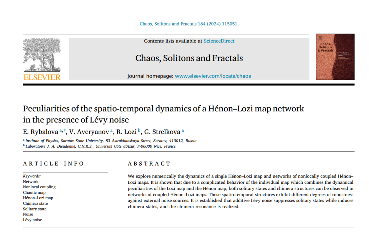 3. V. M. Averyanov, E. V. Rybalova, R. Lozi, G. I. Strelkova. Peculiarities of the spatio-temporal dynamics of a Hénon–Lozi map network in the presence of Lévy noise. Chaos, Solitons and Fractals 184 — 115051 — 115051 — 2024.