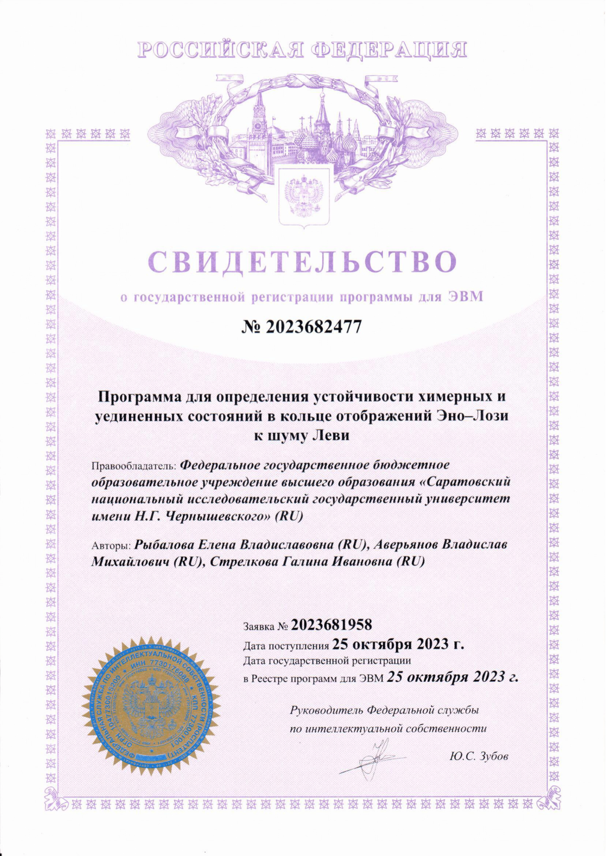 Программа для определения устойчивости химерных и уединенных состояний в кольце отображений Эно-Лози к шуму Леви, №2023682477, 25 октября 2023 г. Авторы: Рыбалова Е.В., Аверьянов В.М., Стрелкова Г.И.