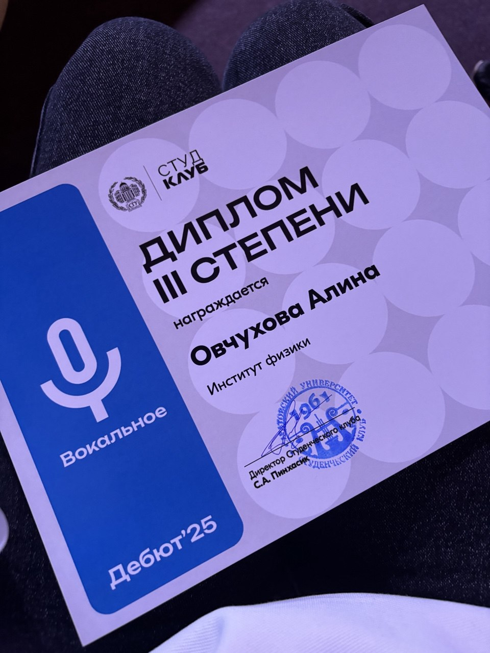 Творческий потенциал Алины раскрылся благодаря университетскому конкурсу «Дебют», который стал для неё первым выходом на сцену вуза. В рамках конкурса Алина проявила себя сразу в двух направлениях: она заняла 2 место в танцевальном направлении и 3 место в вокальном направлении, продемонстрировав разносторонние творческие способности, артистизм и уверенность на сцене. Участие в проекте позволило ей не только заявить о себе, но и получить ценный опыт публичных выступлений и командной работы.