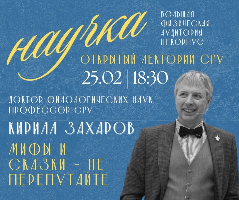 Институт физики продолжает новый университетский просветительский спецпроект – открытый лекторий «Научка». Вторым лектором проекта станет профессор кафедры общего литературоведения и журналистики СГУ К.М. Захаров, а темой станут мифы и сказки.