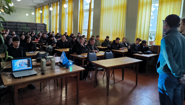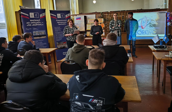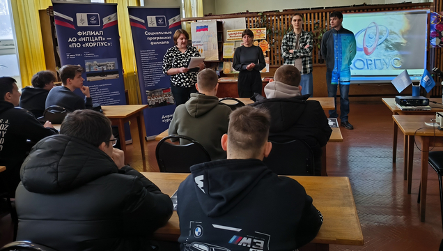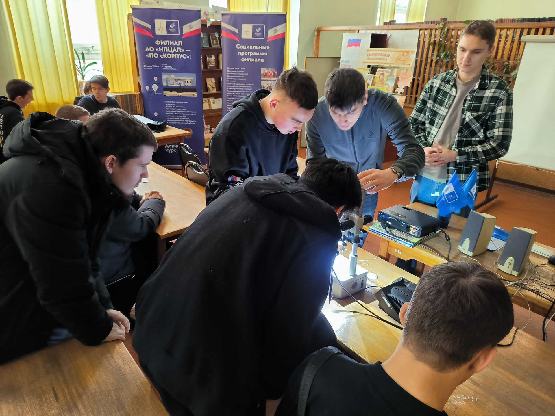 Представители АО «НПЦ АП» - «ПО Корпус», Иванов Алексей Александрович (ведущий инженер-электроник), Талайков Егор Валериевич (инженер-конструктор), Нигович Альбина Васильевна (ведущий специалист управления кадров), Рачкова Анна Андреевна (специалист управления кадров) предоставили студентам наглядный демонстрационный и раздаточный материал (буклеты, стенды), мультимедийные средства (видеофильм и презентация), паяльная станция.