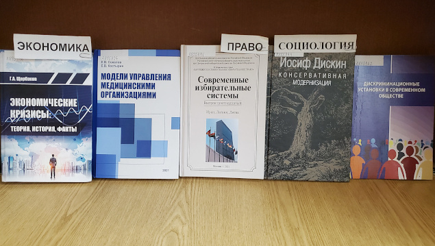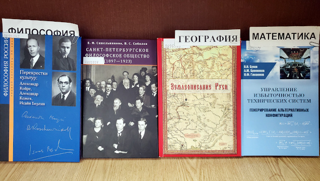 На выставке представлены монографии, сборники статей, учебные пособия, изданные в 2020-2024 годах в разделах: история (11), философия (2), религиоведение (1), искусство (3), психология (5), социология (2), право (4), образование (2), политика (4), языкознание (1), литературоведение (8), медицина (2), биология (1), география (1), математика (3), физика (3), экономика (1), военные науки (3) и Personalia (2).
