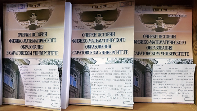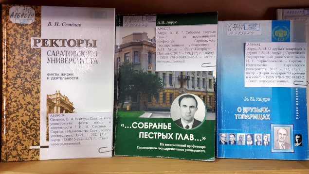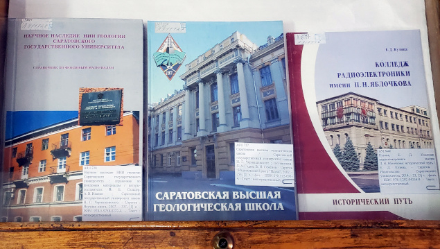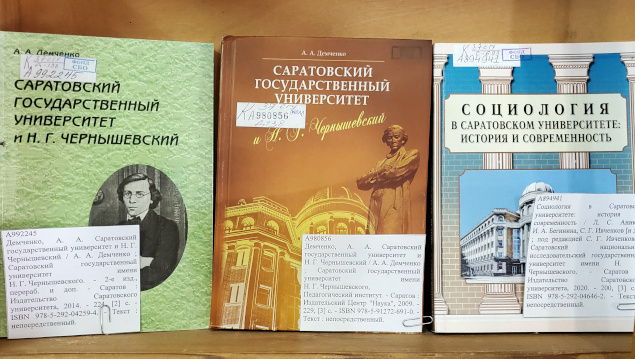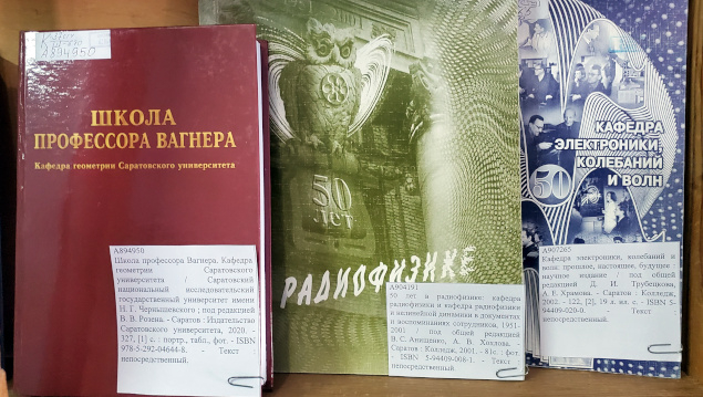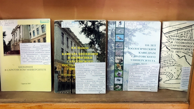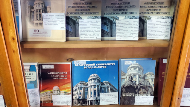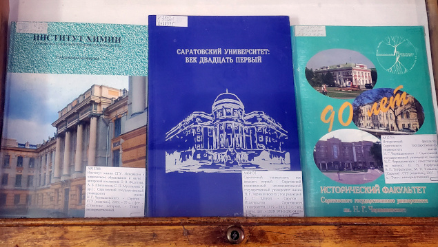На выставке представлена литература, посвящённая Саратовскому национальному исследовательскому государственному университету имени Н. Г. Чернышевского и научной деятельности сотрудников университета.