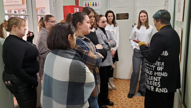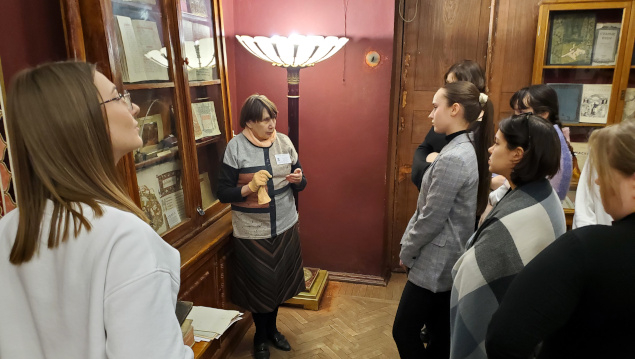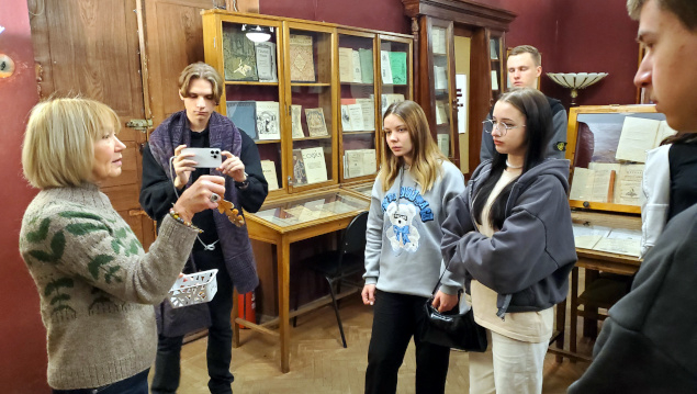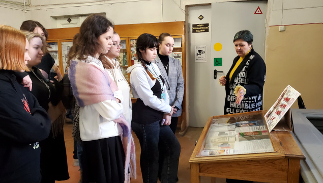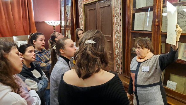 Во второй части экскурсии на выставке по истории русской книги студенты узнали об особенностях рукописных и старопечатных изданий, о журналах екатерининского, петровского времени и Серебряного века, увидели издания с автографами, познакомились с особенностями формирования фонда отдела редких книг и рукописей, услышали о коллекционерах-дарителях.